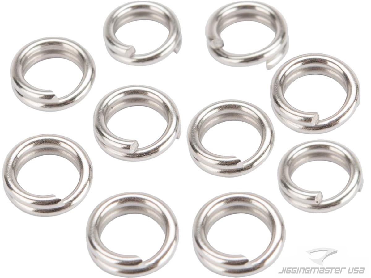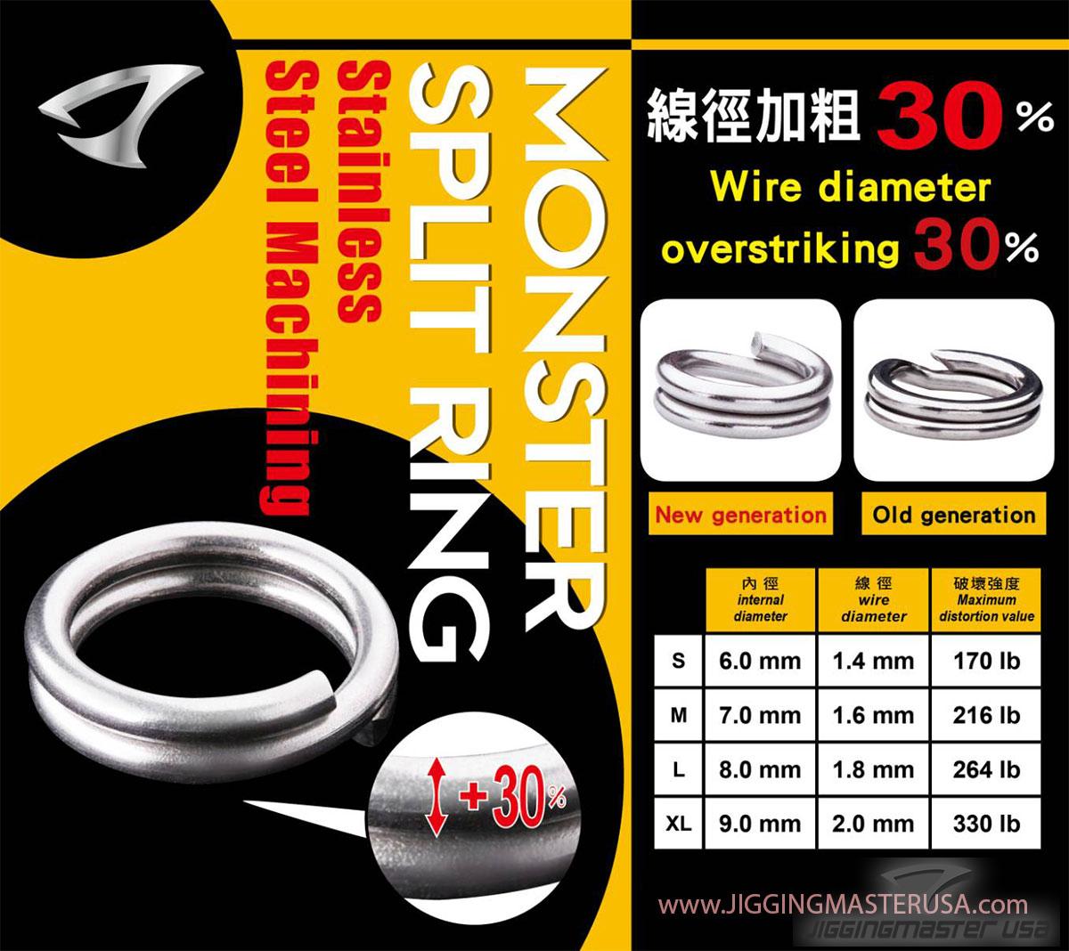 The Jigging Master Monster Split Rings are optimized split rings that returns to it's original shape after you attach the jig, is stronger than traditional split rings, and made out of high quality SUS304 stainless steel for maximum performance. The wire diameter is designed and machined with 30% overstriking diameter for that monster fight of your life time!